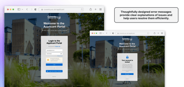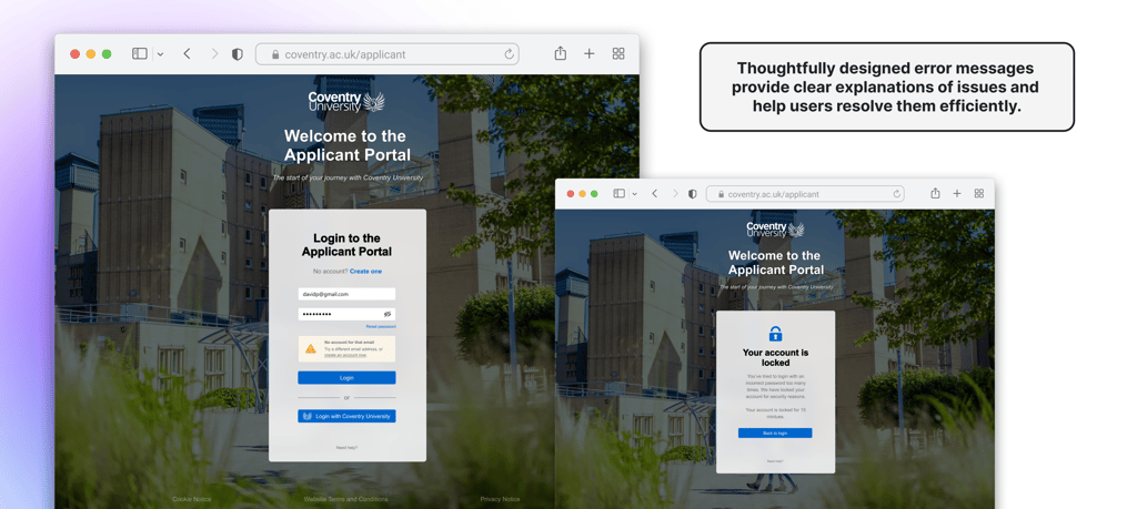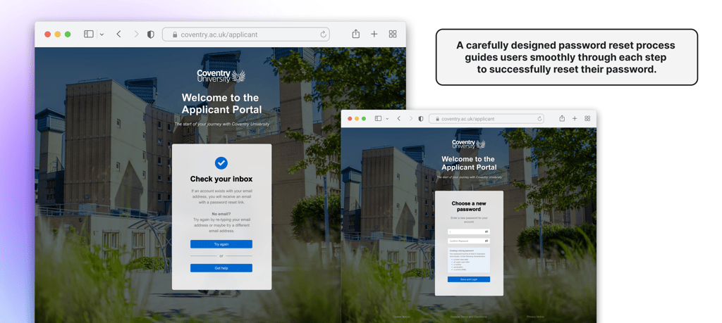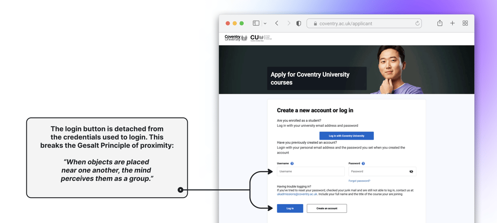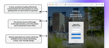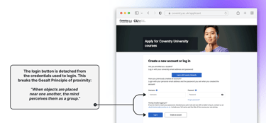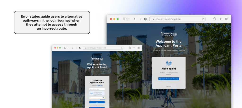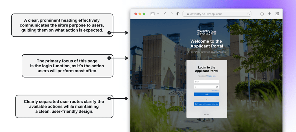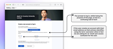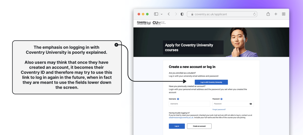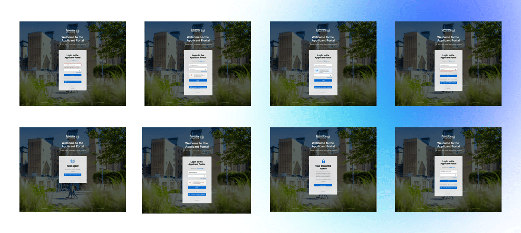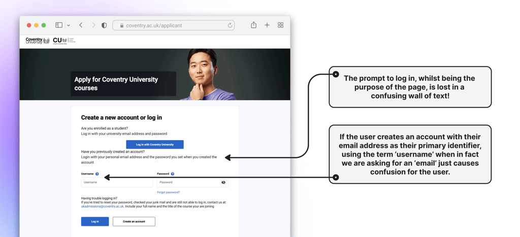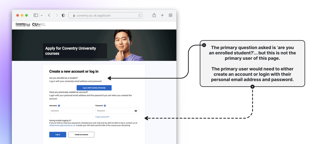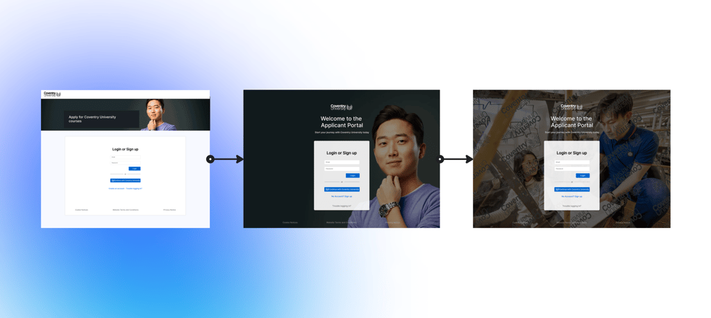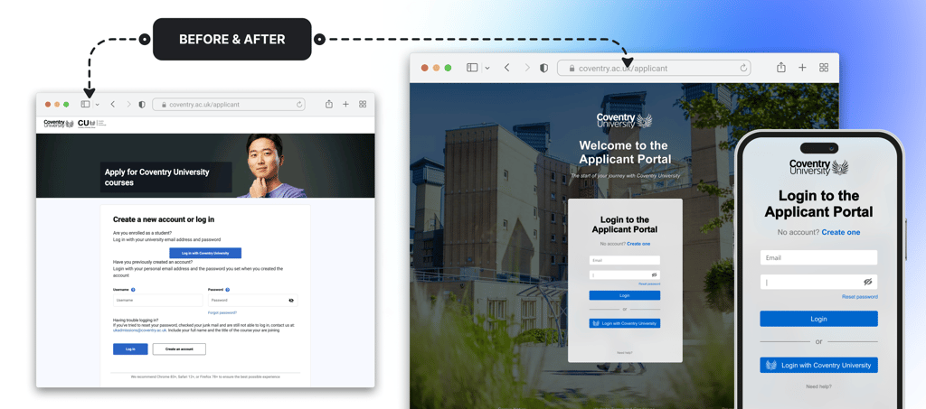 It only took one glance at the existing login page to spot the issues that needed attention. For Coventry University, applications are the primary revenue stream. Any friction in the process of submitting an application is not just a usability concern—it directly impacts the bottom line. And, of course, it was frustrating for prospective students trying to navigate the clunky interface!