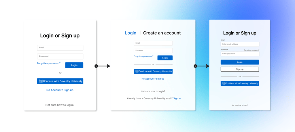 To tackle the problem, I led the UX team in desk research, analyzing login experiences from across the web. We studied layouts, user flows, error handling, and how each journey guided users effectively. This gave us a foundation of user expectations that we could adapt to Coventry University’s unique needs.