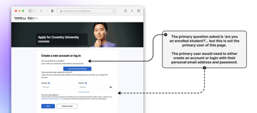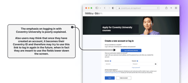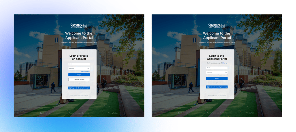 Summary: A cluttered and confusing login screen was creating friction in Coventry University’s application process, lowering applicant numbers and increasing support queries. I led a UX team to redesign the login experience, simplifying options, reducing friction, cutting support enquiries, and boosting application conversions.